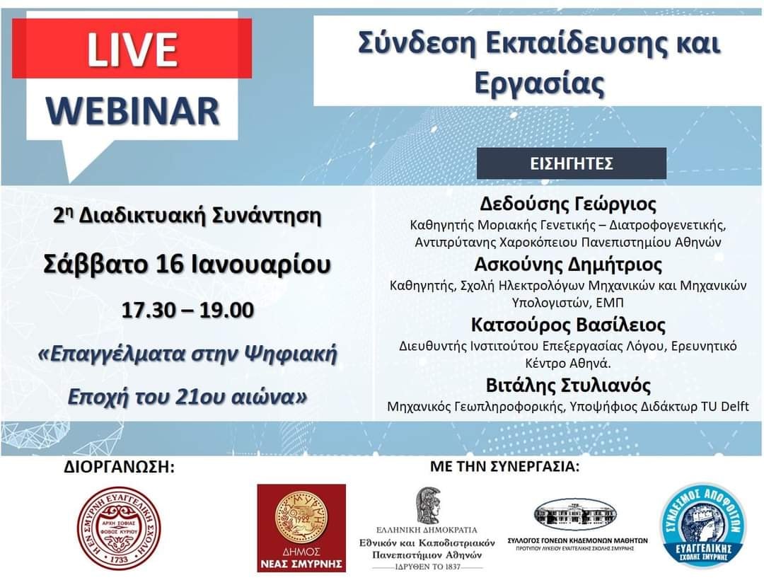 Το Σάββατο 16 Ιανουαρίου στις 17.30 με 19.00 θα πραγματοποιηθεί η 2η Διαδικτυακή Συνάντηση με θέμα “Επαγγέλματα στην Ψηφιακή εποχή του 21ου Αιώνα” που οργανώνεται από το Πρότυπο Γενικό Λύκειο Ευαγγελικής Σχολής Σμύρνης σε συνεργασία με τον Δήμο Νέας Σμύρνης, τον Σύνδεσμο Αποφοίτων της Σχολής, το Παιδαγωγικό Τμήμα Δευτεροβάθμιας Εκπαίδευσης του Εθνικού και Καποδιστριακού Πανεπιστημίου Αθηνών (ΕΚΠΑ) και την υποστήριξη του Συλλόγου Γονέων και Κηδεμόνων του Λυκείου της Ευαγγελικής.
