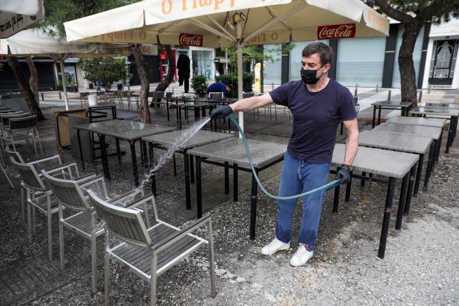 Τις πόρτες τους άνοιξαν και πάλι από σήμερα τα καταστήματα της εστίασης και οι ιδιοκτήτες έσπευσαν από το πρωί να στρώσουν τα τραπέζια στους εξωτερικούς χώρους των καταστημάτων τους, υποδεχόμενοι τους πρώτους πελάτες.
