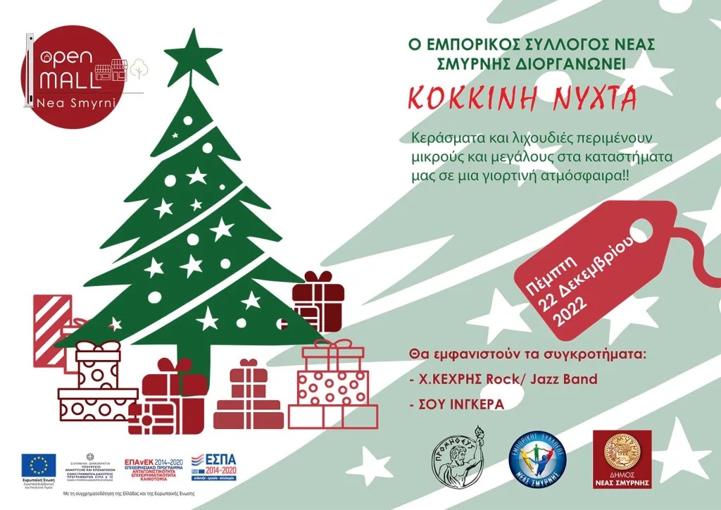 O Εμπορικός Σύλλογος Νέας Σμύρνης, σε συνεργασία με το Επαγγελματικό Επιμελητήριο Αθηνών και το Δήμο Ν. Σμύρνης, θα διοργανώσει «Κόκκινη Νύχτα» την Πέμπτη 22 Δεκεμβρίου 2022.