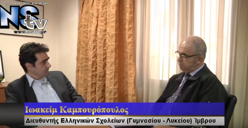 Στο Σύλλογο Ιμβρίων ο Ιωακείμ Καμπουρόπουλος Διευθυντής του Γυμνασίου και Λυκείου στην Ίμβρο, μίλησε στην κάμερα της Διαδικτυακής Τηλεόρασης της Νέας Σμύρνης www.nstv.gr και στον Δημήτρη Πετρόπουλο, για την πρόσφατη ιστορία της εκπαίδευσης στην Ίμβρο, την νέα μέρα που ξημερώνει μετά το άνοιγμα ελληνικού σχολείου αλλά και τις δυσκολίες που αντιμετωπίζει το εκπαιδευτικό αυτό εγχείρημα. «Μετά την υπογραφή της συνθήκης της Λοζάνης και την εξαίρεση του πληθυσμού της Ίμβρου και της Τενέδου από την ανταλλαγή πληθυσμών μεταξύ Ελλάδας-Τουρκίας, τέθηκε εκπαιδευτικό ζήτημα» μας θύμισε ο Ι.Καμπουρόπουλος , εξηγώντας παράλληλα ότι μεταξύ του 1923 και περίπου του 1950 μπήκαν οι βάσεις κάποιας μειονοτικής παιδείας με φοβερές βέβαια δυσκολίες. Στις αρχές της δεκαετίας του 50 «πραγματοποιείται μία σημαντική αναγέννηση με τον τότε Μητροπολίτη Μελίτων Χατζή να ηγείται με πολύ θετικό αποτέλεσμα για την εκπαίδευση στο νησί». Πρόσθεσε δε ότι τα σημερινά κτήρια που στεγάζονται τα σχολεία στην Ίμβρο οφείλουν την ύπαρξή του σε αυτή την προσπάθεια του τότε Μητροπολίτη, κατοίκων αλλά και βέβαια Ιμβρίων της διασποράς.
