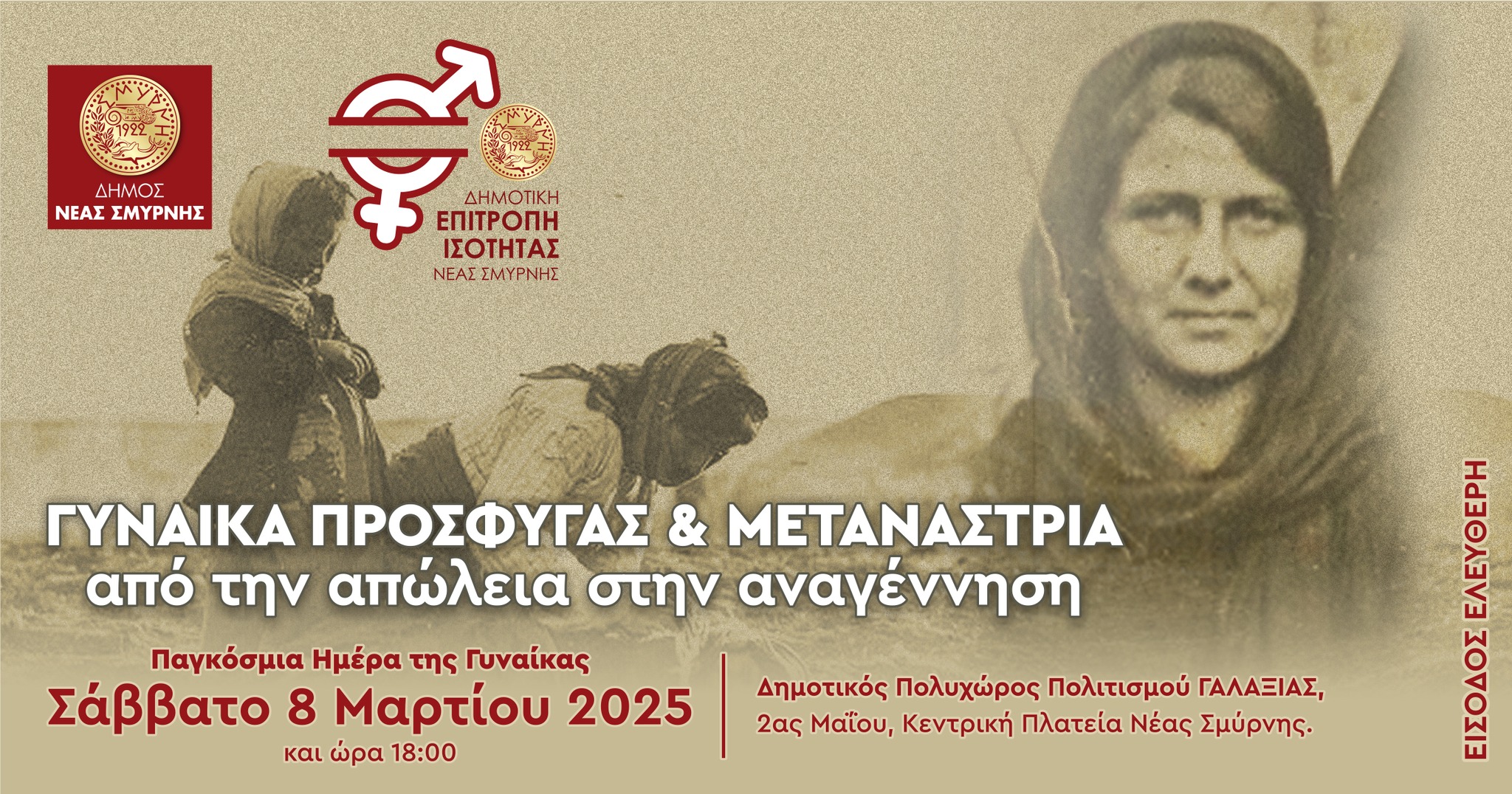 Με μια εκδήλωση αφιερωμένη στην πλέον ευάλωτη κατηγορία γυναικών ο Δήμος Νέας Σμύρνης τιμά την 8η Μαρτίου, Παγκόσμια Ημέρα της Γυναίκας. Η εκδήλωση με θέμα «Γυναίκα πρόσφυγας & μετανάστρια – από την απώλεια στην αναγέννηση» θα πραγματοποιηθεί το Σάββατο 8 Μαρτίου, ώρα 18:00, στον Δημοτικό Πολυχώρο «Γαλαξίας».