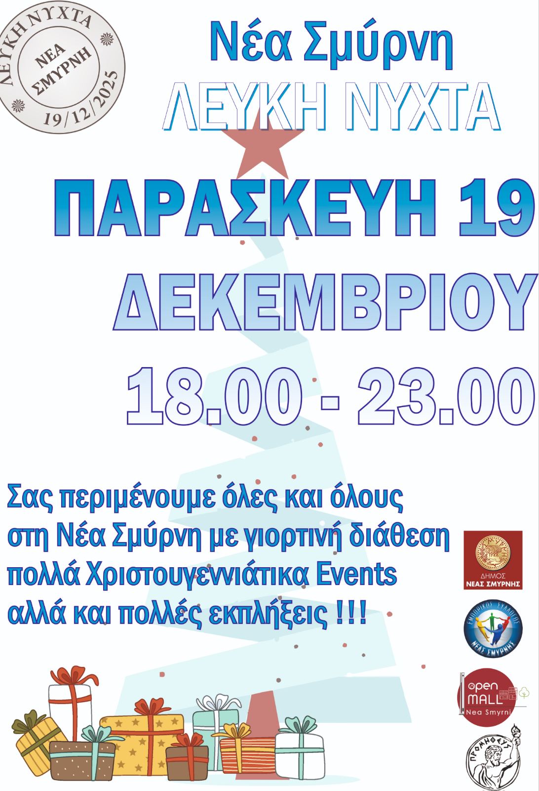 Ο Εμπορικός Σύλλογος Νέας Σμύρνης και ο Δήμος Νέας Σμύρνης διοργανώνουν Λευκή Νύχτα την Παρασκευή 19 Δεκεμβρίου