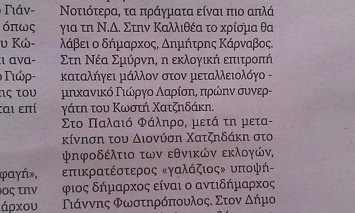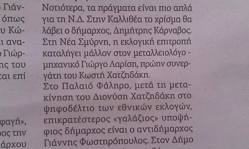 Στη Νέα Σμύρνη την προτίμηση της εκλογικής επιτροπής για τις αυτοδιοικητικές κάλπες που έχει ορίσει ο Κυριάκος Μητσοτάκης, συγκεντρώνει για υποψήφιος Δήμαρχος ο Γιώργος Λαρίσσης, πρώην συνεργάτης του Κωστή Χατζηδάκη, Γεν.Γραμματέας Β1 Νομαρχιακής της Νέας Δημοκρατίας και Αναπληρωτής Γραμματέας της Γραμματείας Σχέσεων Κοινωνίας-Κόμματος της Νέας Δημοκρατίας.