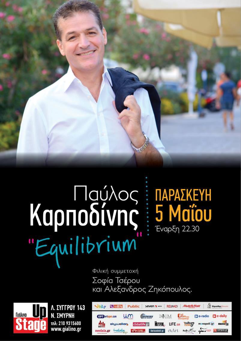 Αυτή την Παρασκευή 5/5 σε μια μοναδική βραδυά στο Γυάλινο μουσικό θέατρο "up stage " ,ισορροπώντας με τραγούδια συνοδοιπόρους απο την ελληνική δισκογραφία ,σε μια ιδιαίτερη παράσταση. "Equilibrium ". Ο Παύλος Καρποδίνης με την Σοφία Τσέρου , τον Αλέξανδρος Ζηκόπουλο και πενταμελή ορχήστρα.