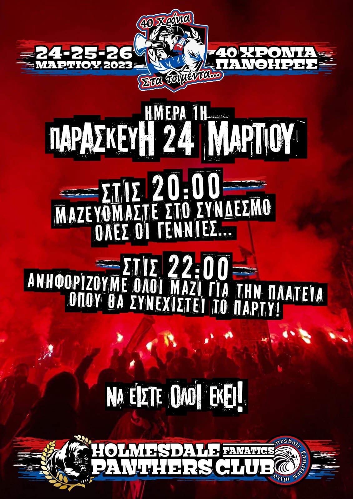 Τη συμπλήρωση 40 χρόνων από την ίδρυσή του γιορτάζει ο σύνδεσμος των Πανθήρων, με τους οργανωμένους οπαδούς του Πανιωνίου να ετοιμάζουν ένα εορταστικό τριήμερο το οποίο θα ξεκινήσει από την Παρασκευή 24 Μαρτίου με συγκέντρωση στο χώρο του συνδέσμου, ενώ στη συνέχεια οι εορτασμοί θα συνεχιστούν στην Πλατεία.