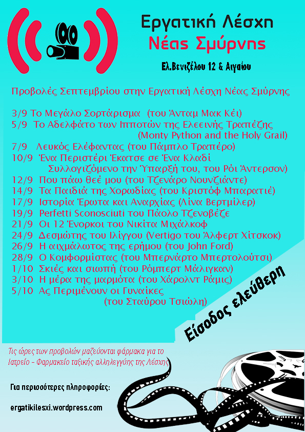 Οι ταινίες του κινηματογράφου για τον Σεπτέβριο που προβάλλονται από την Εργατική Λέσχη Νέας Σμύρνης