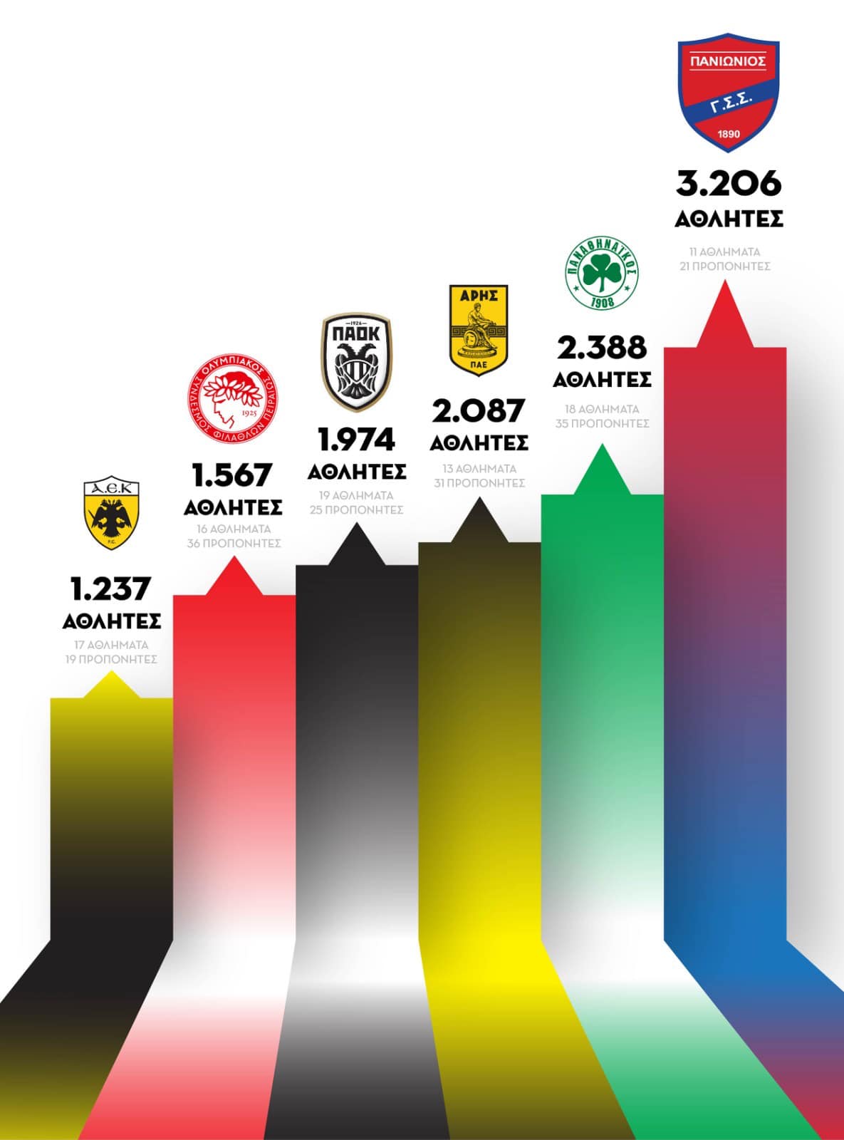 Σύμφωνα με τα στοιχεία αυτά, ο σύλλογος απασχολεί 3.206 αθλητές και αθλήτριες σε 11 αθλήματα και είναι πάνω από ομάδες όπως η ΑΕΚ, ο Ολυμπιακός, ο ΠΑΟΚ, ο Άρης και ο Παναθηναϊκός στη σχετική λίστα.