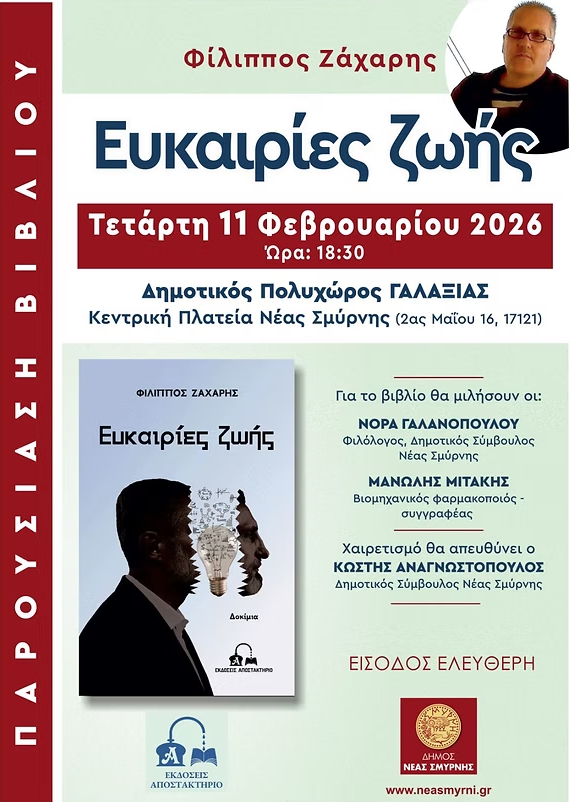 Την Τετάρτη 11 Φεβρουαρίου 2026, ο φιλόλογος και δημοσιογράφος Φίλιππος Ζάχαρης παρουσιάζει το βιβλίο του «Ευκαιρίες ζωής» στον Δημοτικό Πολυχώρο Γαλαξίας στη Νέα Σμύρνη, με ελεύθερη είσοδο για το κοινό.