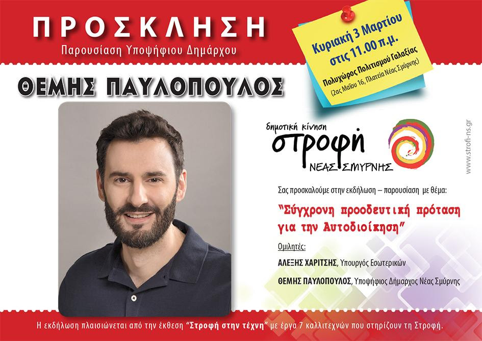 Η Δημοτική Κίνηση ΣΤΡΟΦΗ ΝΕΑΣ ΣΜΥΡΝΗΣ σας προσκαλεί την Κυριακή 3 Μαρτίου, στις 11 π.μ., στον Πολυχώρο Πολιτισμού Γαλαξίας, 2ας Μαΐου 16, Πλατεία Νέας Σμύρνης, στην εκδήλωση-παρουσίαση με θέμα :