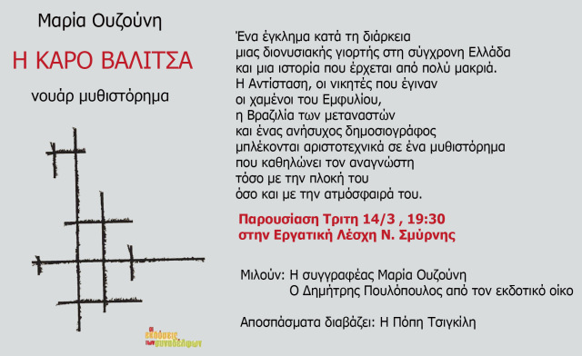 Για το βιβλίο θα μιλήσουν η συγγραφέας Μαρία Ουζούνη και εκ μέρους των εκδόσεων των συναδέλφων ο Δημήτρης Πετρόπουλος.