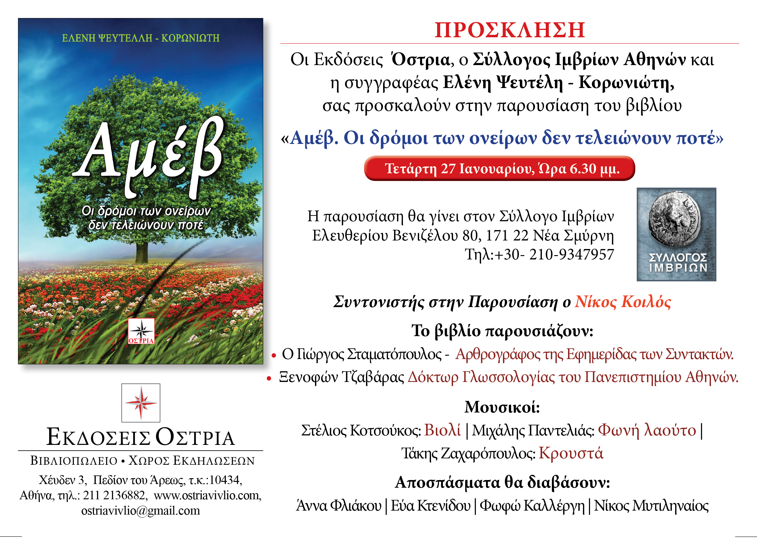 Παρουσίαση του βιβλίου «Αμέβ. Οι δρόμοι των ονείρων δεν τελειώνουν ποτέ» της Ελένης Ψευτέλλη-Κορωνιώτη στο Σύλλογο Ιμβρίων – Τετάρτη 27/1/2016