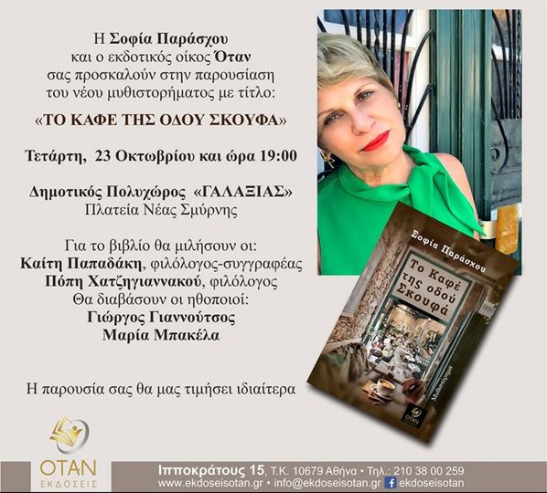 Το νέο της μυθιστόρημα με τίτλο “Το καφέ της οδού Σκουφά” (εκδόσεις Όταν) παρουσιάζει την Τετάρτη 23 Οκτωβρίου, ώρα 19:00 η εκπαιδευτική υπεύθυνη της Λέσχης Ανάγνωσης του Δήμου Νέας Σμύρνης Σοφία Παράσχου.