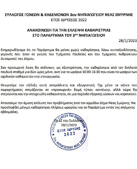 Παυλόπουλος: πλημμελή καθαριότητα λόγω έλλειψης προσωπικού στο 3ο Νηπιαγωγείο Νέας Σμύρνης