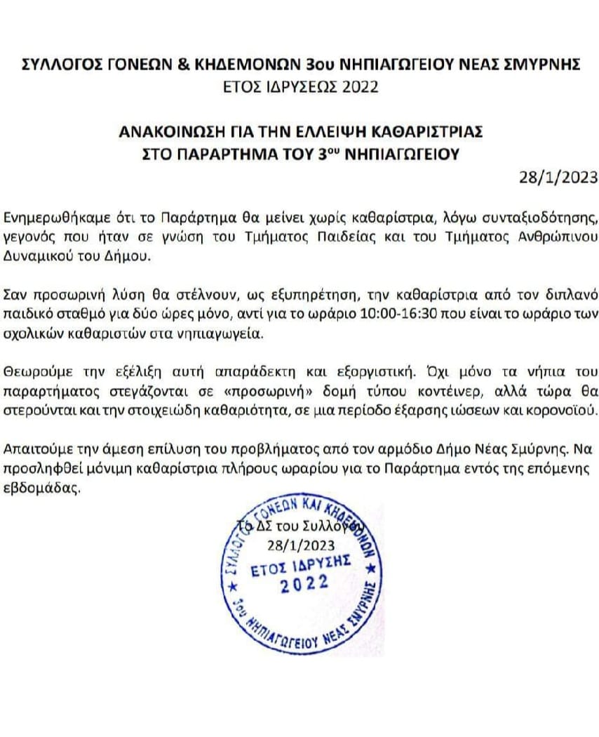 Το παράρτημα του 3ου Νηπιαγωγείου Νέας Σμύρνης από σήμερα έχει πλημμελή καθαριότητα λόγω έλλειψης προσωπικού. Αρμόδιος Αντιδήμαρχος Παιδείας δεν υπάρχει, καθώς η Δημοτική Αρχή δεν φιλοτιμήθηκε να ορίσει τον περασμένο Σεπτέμβρη (τόσο ψηλά αξιολογεί τα παιδιά μας και την εκπαιδευτική διαδικασία). Την ίδια στιγμή οι γονείς παραπέμπονται "από τον Άννα στον Καϊάφα" για να εκφράσουν το επείγον αίτημά τους και να λυθεί αυτό το σοβαρό ζήτημα. Και μη χειρότερα...
