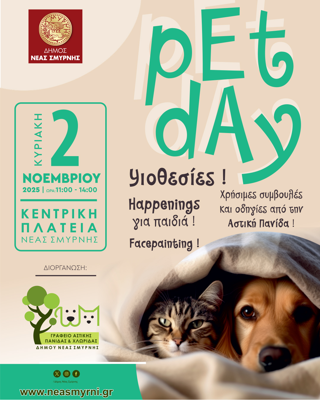 Ακόμα ένα PET DAY, γιορτή υιοθεσίας και δημιουργικής ενημέρωσης, διοργανώνει η Αστική Πανίδα του Δήμου Νέας Σμύρνης την Κυριακή 2 Νοεμβρίου στην κεντρική Πλατεία.