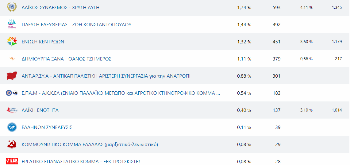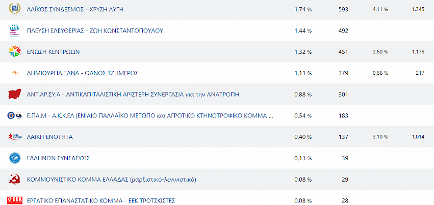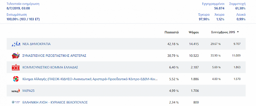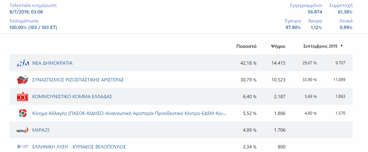 Mε 61% συμμετοχή και στο 100% της καταμέτρησης, οι 34,910 εγγεγραμμένοι (εκ των 56,874) ψήφισαν στις Εθνικές Εκλογές της Κυριακής 7-7-2019 τα ακόλουθα