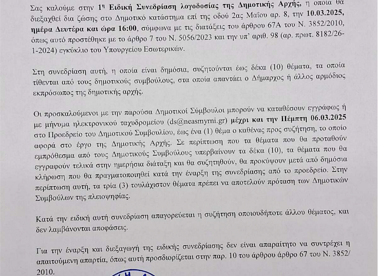 Πρόσκληση 1ης Ειδικής Συνεδρίασης Λογοδοσίας της Δημοτικής Αρχής