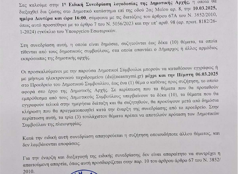 Ο Δήμος Νέας Σμύρνης καλεί τους ενδιαφερόμενους στην 1η Ειδική Συνεδρίαση λογοδοσίας της Δημοτικής Ατχής, η οποία θα λάβει χώρα τη Δευτέρα 10 Μαρτίου. Στη συνεδρίαση αυτή συζητούνται έως δέκα θέματα που τίθενται από τους δημοτικούς συμβούλους και στα οποία απαντά ο Δήμαρχος ή άλλος αρμόδιος, ενώ οι προσκαλούμενοι δημοτικοί σύμβουλοι μπορούν να καταθέσουν εγγράφως το θέμα που θέλουν να θέσουν προς συζήτηση μέχρι την Πέμπτη 6 Μαρτίου.