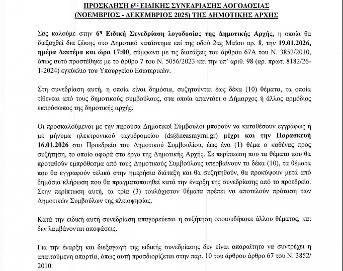 Ο Δήμος Νέας Σμύρνης καλεί τους ενδιαφερόμενους στην 6η Ειδική Συνεδρίαση Λογοδοσίας που θα γίνει τη Δευτέρα 19 Ιανουαρίου στις 17:00 στο Δημοτικό Κατάστημα: