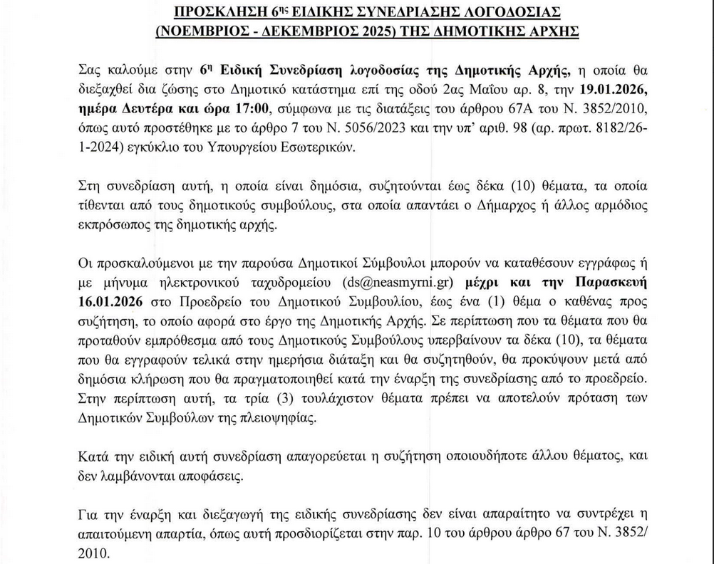 Πρόσκληση 6ης Ειδικής Συνεδρίασης Λογοδοσίας της Δημοτικής Αρχής