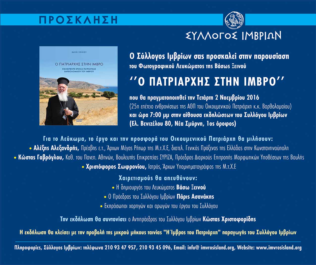 Παρουσίαση του Φωτογραφικού Λευκώματος της Βάσως Ξεινού «Ο Πατριάρχης στην Ίμβρο»