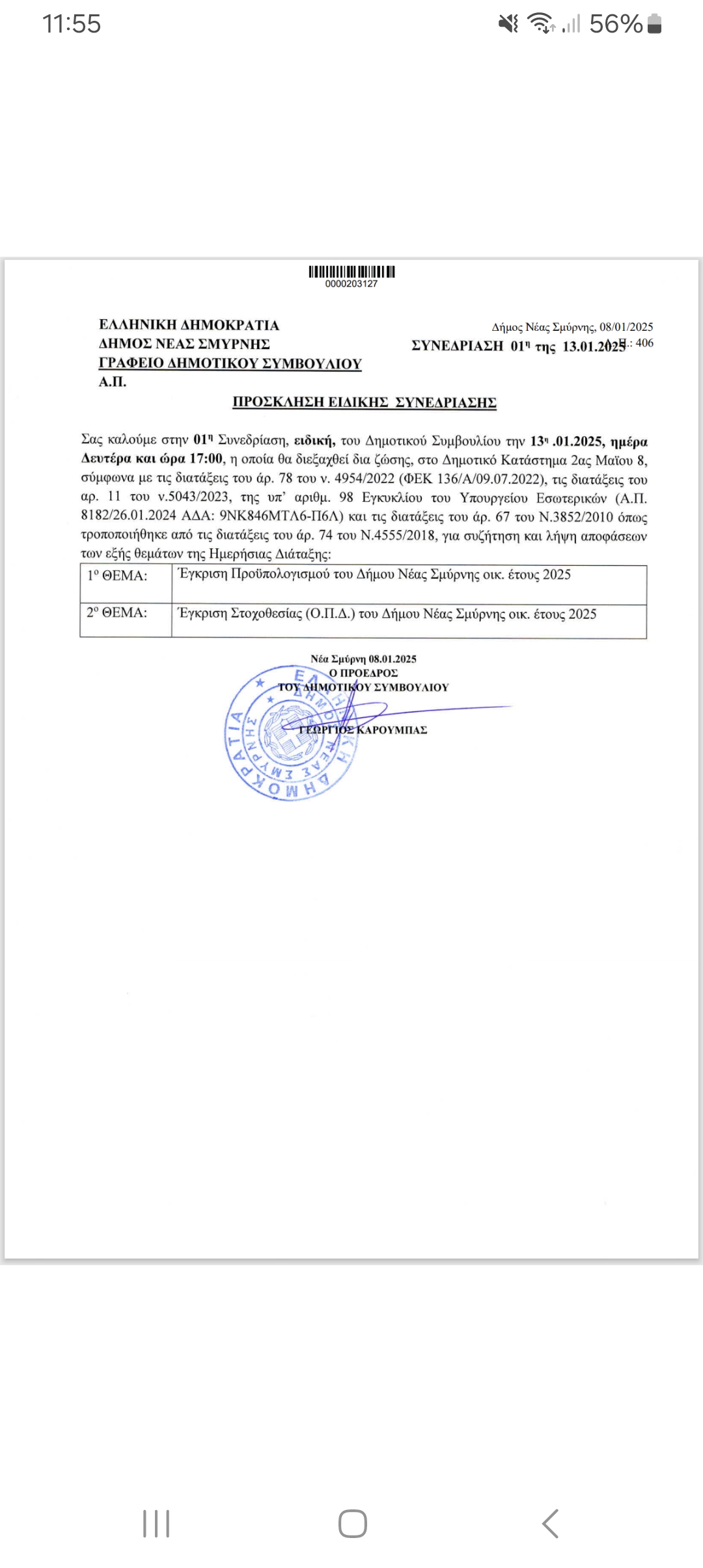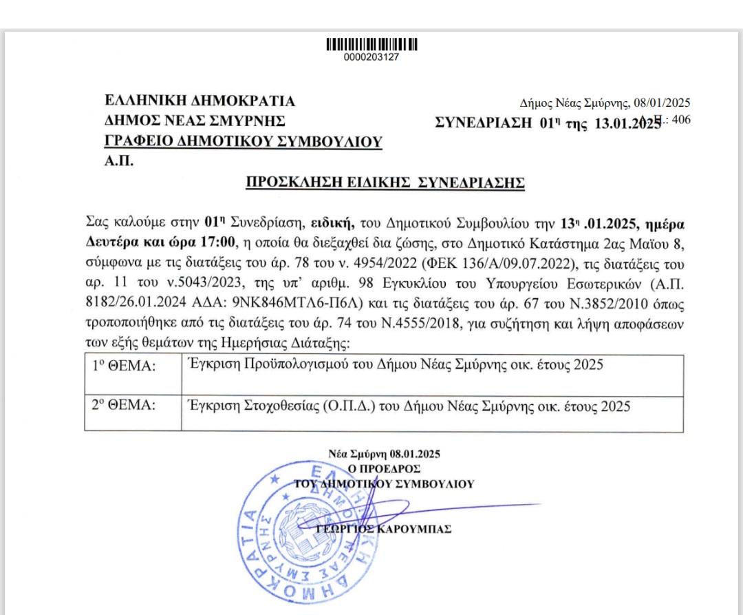 Πρόσκληση του Δήμου Νέας Σμύρνης στην 1η Ειδική Συνεδρίαση του Δημοτικού Συμβουλίου που θα γίνει σήμερα Δευτέρα 13/1 και ώρα 17:00 με θέματα την έγκριση προυπολογισμού του οικονομικού έτους 2025 και την έγκριση στοχοθεσίας του ίδιου έτους.