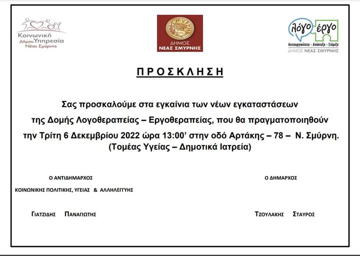 Πρόσκληση για τα εγκαίνια των νέων εγκαταστάσεων της Δομής Λογοθεραπείας – Εργοθεραπείας του Δήμου Νέας Σμύρνης