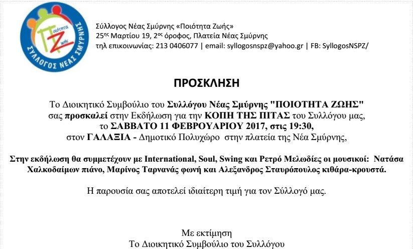 ΠΡΟΣΚΛΗΣΗ ΓΙΑ ΤΟ ΚΟΨΙΜΟ ΤΗΣ ΠΙΤΑΣ ΤΟΥ ΣΥΛΛΟΓΟΥ Ν.ΣΜ. "ΠΟΙΟΤΗΤΑ ΖΩΗΣ" 11/2/17, 19:30 - στον ΓΑΛΑΞΙΑ
