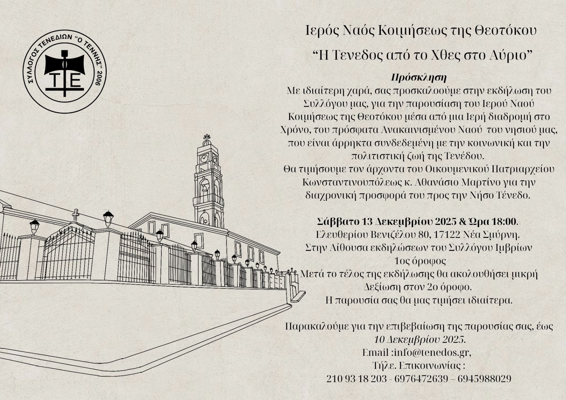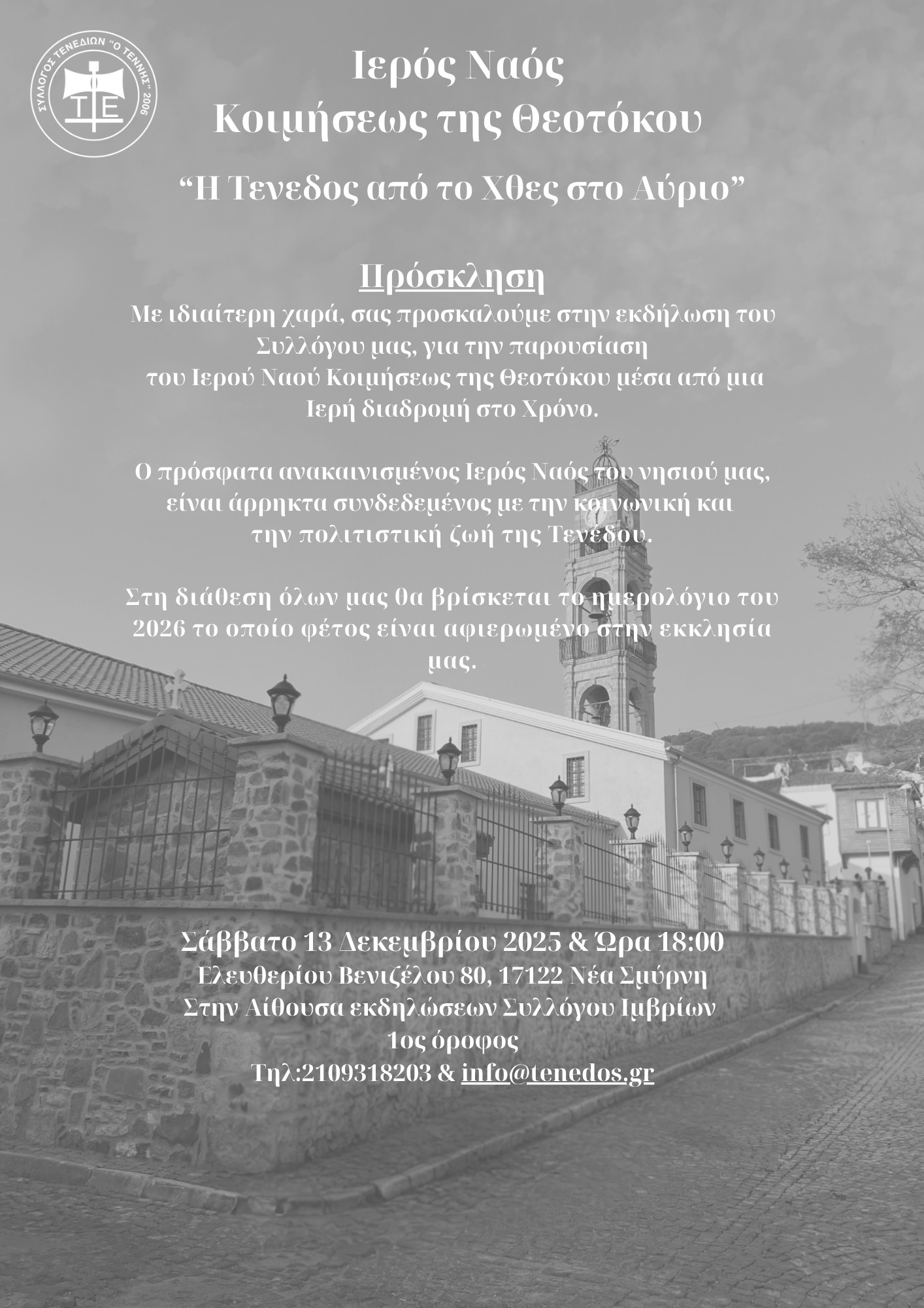 Ο Σύλλογος Τενεδίων "Ο Τέννης" 2006 προσκαλεί όσους επιθυμούν στην εκδήλωση για την παρουσίαση του Ιερού Ναού Κοιμήσεως Θεοτόκου το Σάββατο 13 Δεκεμβρίου στις 18:00, στην Αίθουσα Εκδηλώσεων του Συλλόγου Ιμβρίων.
