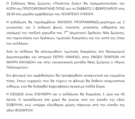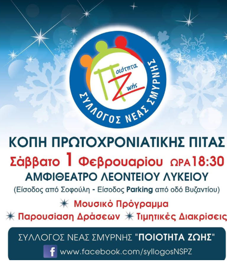 Το Σάββατο 1 Φλεβάρη και ώρα 18:30 σας προσκαλούμε στην κοπή της πίτας του Συλλόγου μας. Σας περιμένουμε με χαρά! ΠΑΡΚΙΝΓΚ από την είσοδο της οδού ΒΥΖΑΝΤΙΟΥ