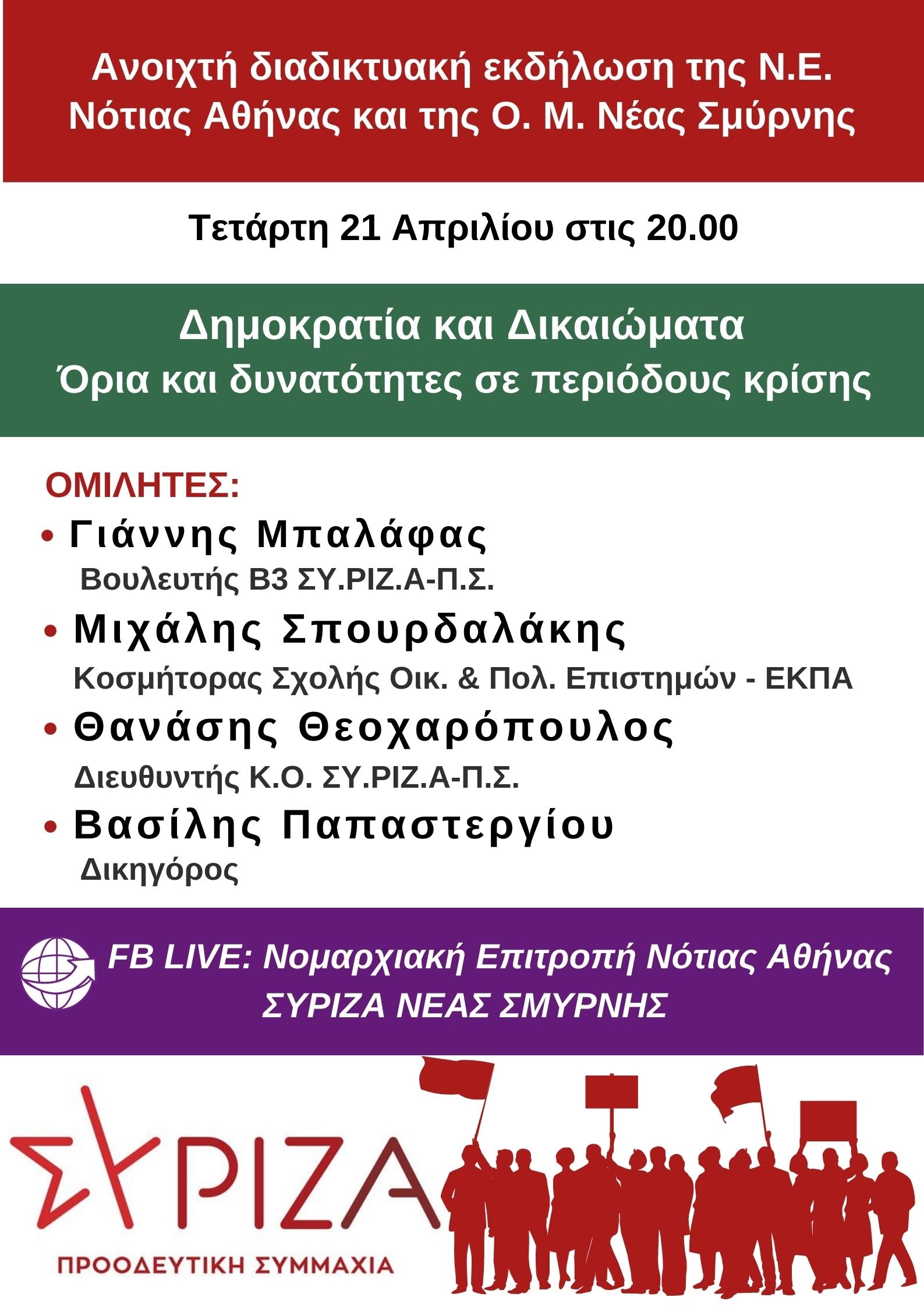 Η Νομαρχιακή Επιτροπή Νότιας Αθήνας του ΣΥΡΙΖΑ-ΠΣ διργανώνει την Τετάρτη, 21 Απριλίου στις 8 μμ., ανοιχτή διαδικτυακή εκδήλωση με θέμα: