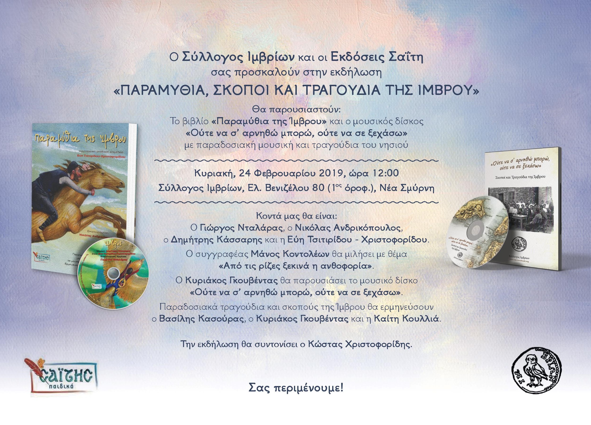 Δύο έργα που αποτυπώνουν το λαογραφικό πλούτο της Ίμβρου, το βιβλίο «Παραμύθια της Ίμβρου» και ο μουσικός δίσκος «Ούτε να σ’ αρνηθώ μπορώ, ούτε να σε ξεχάσω» παρουσιάζονται για πρώτη φορά από κοινού την Κυριακή, 24 Φεβρουαρίου, ώρα 12:00 στο Σύλλογο Ιμβρίων (Ελ. Βενιζέλου 80, 1ος όροφ. Νέα Σμύρνη). Μπορείτε να κατεβάσετε εδώ το ενημερωτικό πακέτο (press kit) που περιλαμβάνει Πρόσκληση, Αφίσα, Δελτἰο Τύπου και τα εξώφυλλα των έργων