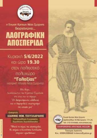 Στο πλαίσιο της προβολής και διάδοσης της πολιτιστικής κληρονομιάς η Ένωση Κρητών Νέας Σμύρνης και ο Δήμος Νέας Σμύρνης διοργανώνουν την Κυριακή 5 Ιουνίου 2022 και ώρα 19:30 – στον πολιτιστικό πολυχώρο «Γαλαξίας» στην κεντρική πλατεία Νέας Σμύρνης – ενημερωτική διάλεξη με θέμα «Ιχνηλατώντας την Κρητική παράδοση στο χτες και το σήμερα – Οι λησμονημένες αλήθειες και οι δημοφιλείς νεωτερισμοί της εποχής μας».