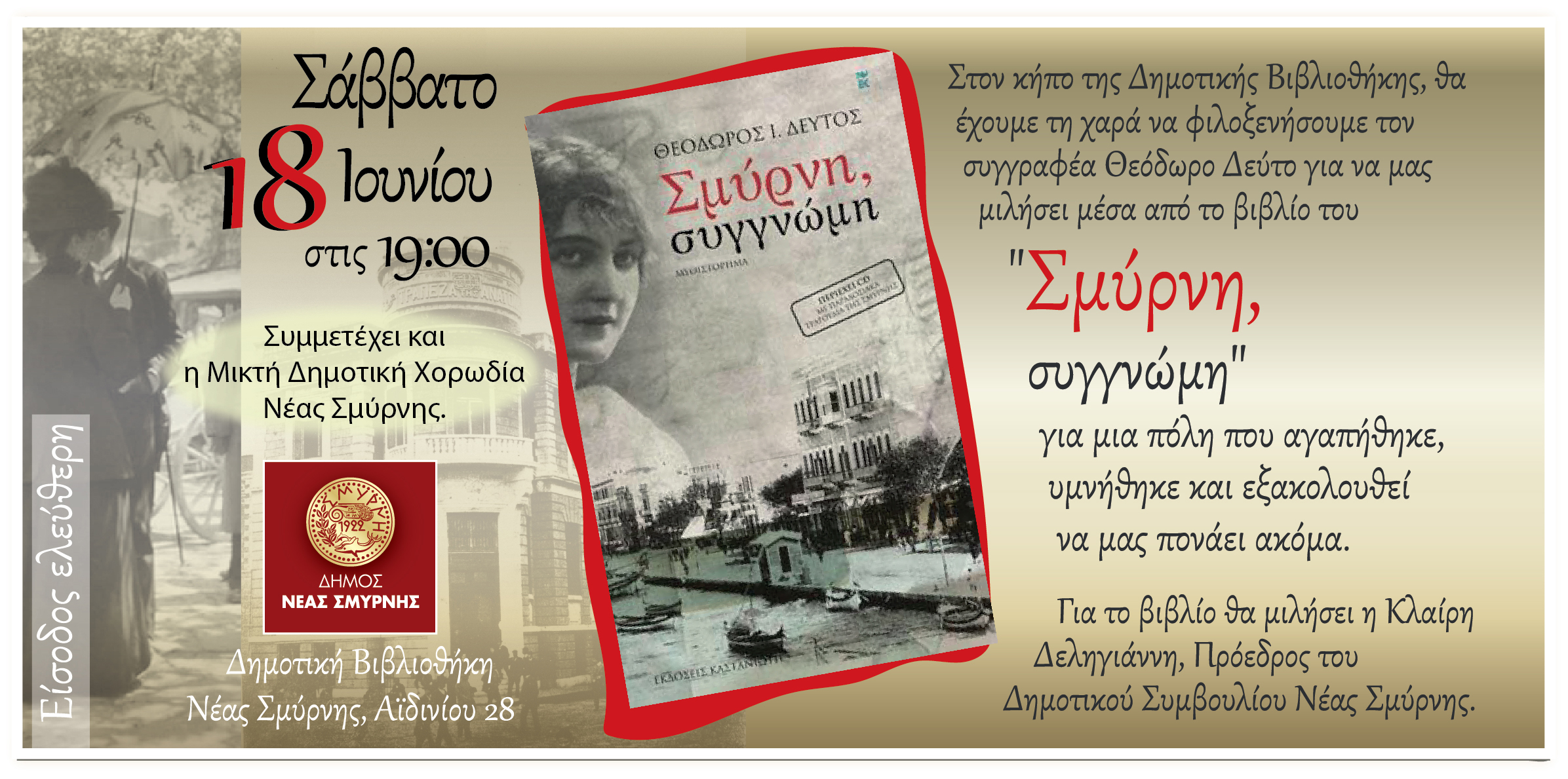 Πρόσκληση σε παρουσίαση του βιβλίου ''Σμύρνη Συγνώμη'' στη Δημοτική Βιβλιοθήκη της Νέας Σμύρνης