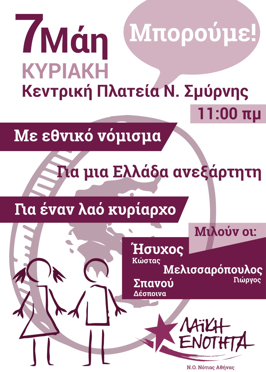 Η Ν.Ε Νότιας Αθήνας της Λαικής Ενότητας ,σας καλεί την Κυριακή 7 Μάη στις 11πμ στην πολιτική συγκέντρωση που οργανώνει στην Πλ΄Ν.Σμύρνης.