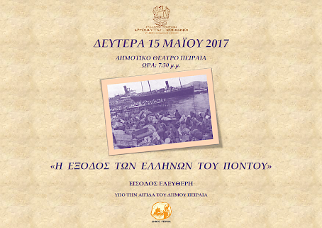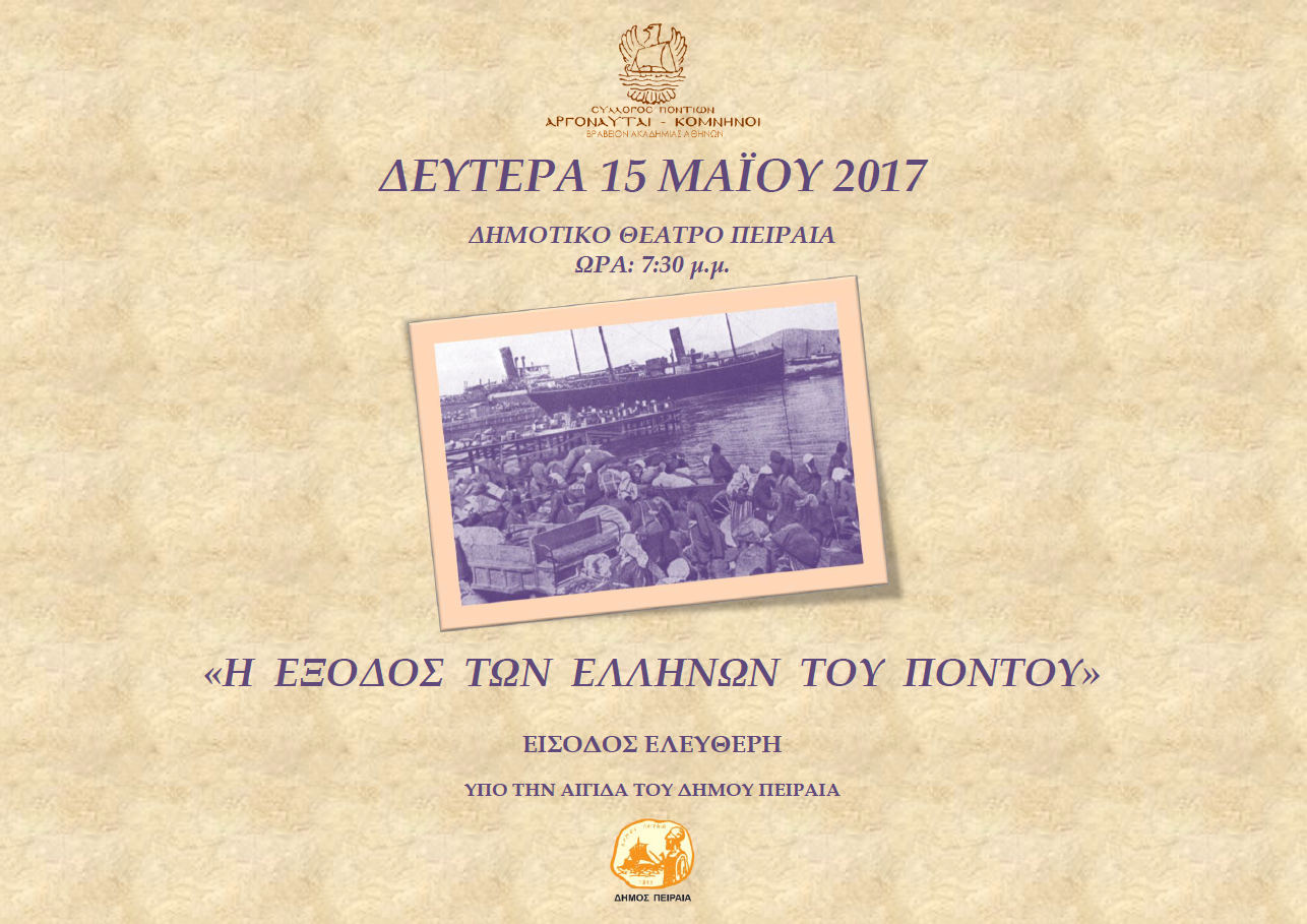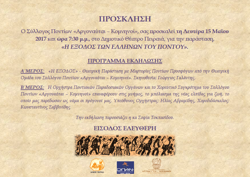 Ο Σύλλογος Ποντίων «Αργοναύται – Κομνηνοί», σας προσκαλεί τη Δευτέρα 15 Μαΐου 2017 και ώρα 7:30 μ.μ., στο Δημοτικό Θέατρο Πειραιά, για την παράσταση,