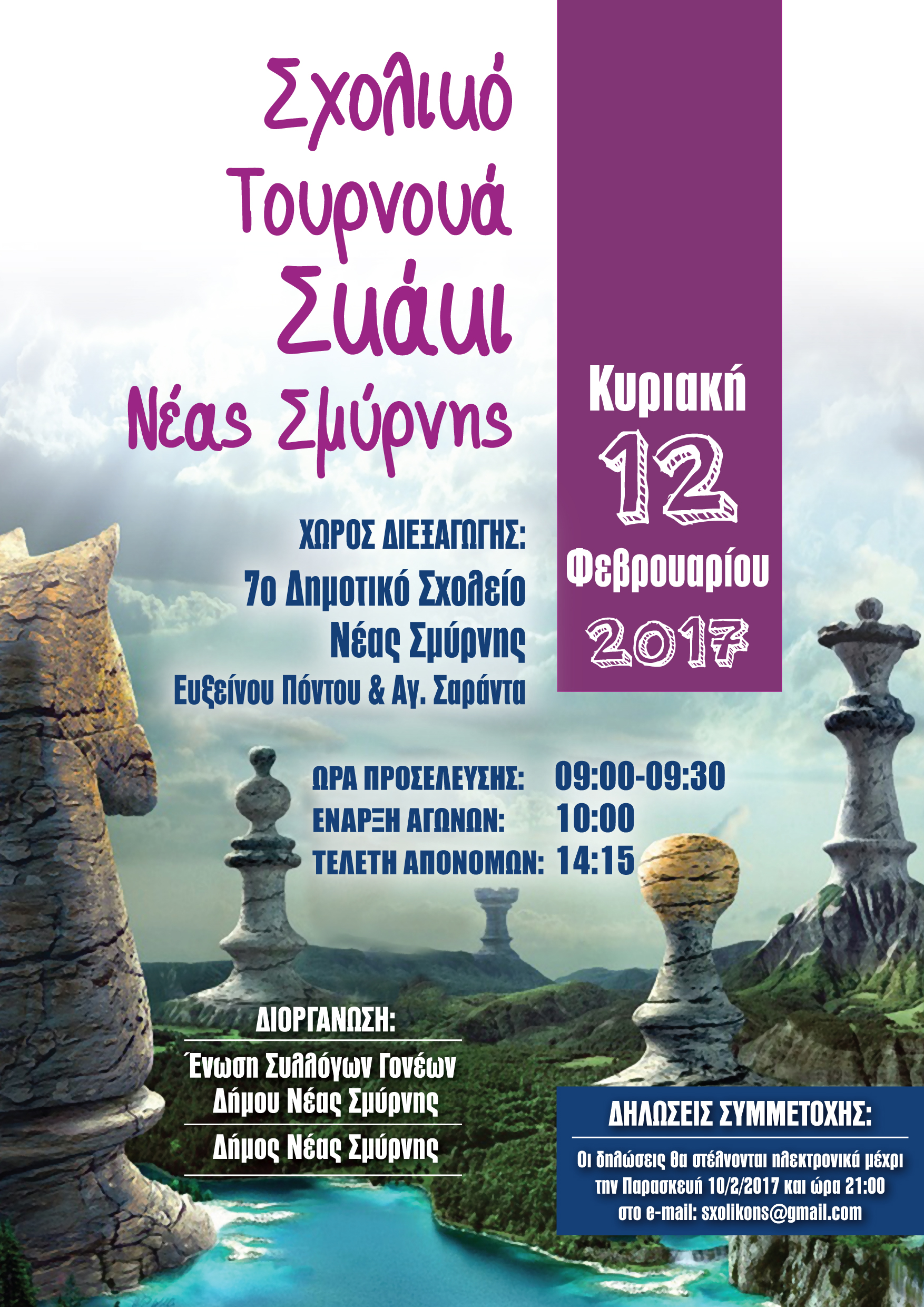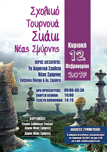 σκάκι για μαθητές των Δημοτικών Σχολείων της πόλης μας που θα πραγματοποιηθεί την Κυριακή 12/2/2017 στο 7ο Δημοτικό Σχολείο για ενημέρωσή σας και ανάλογη συμμετοχή στη δράση που και φέτος διοργανώνουμε.