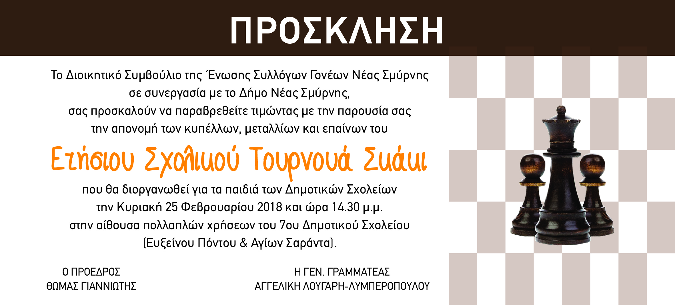 Πρόσκληση του φετινού τουρνουά Σκάκι που, όπως κάθε χρόνο, υλοποιεί η Ένωση μας.