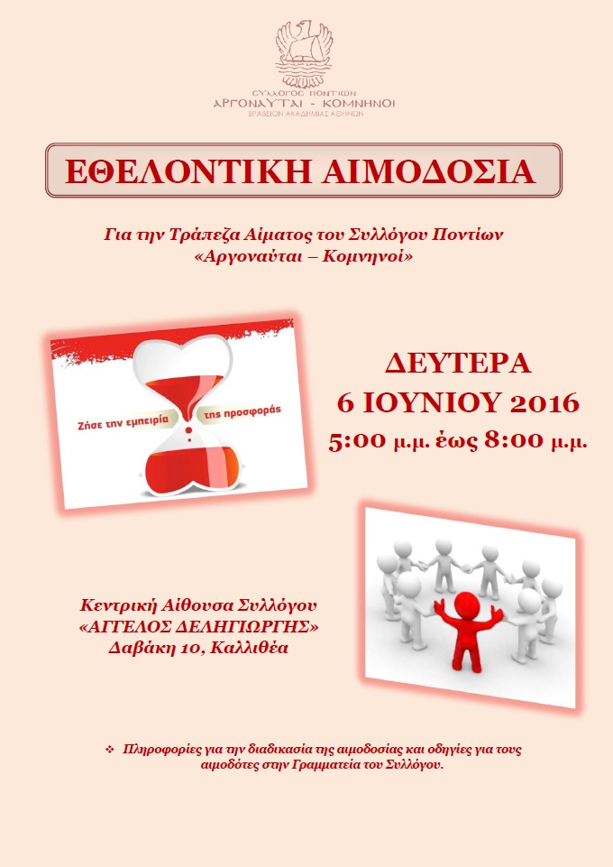 Την Δευτέρα 6 Ιουνίου 2016 και ώρα 17:00-20:00 στην κεντρική Αίθουσα «Άγγελος Δεληγιώργης» του Συλλόγου μας θα πραγματοποιηθεί εθελοντική αιμοδοσία των μελών και φίλων του Συλλόγου μας, για να βοηθήσουμε, όπως κάθε χρόνο, τους συνανθρώπους μας που το χρειάζονται.