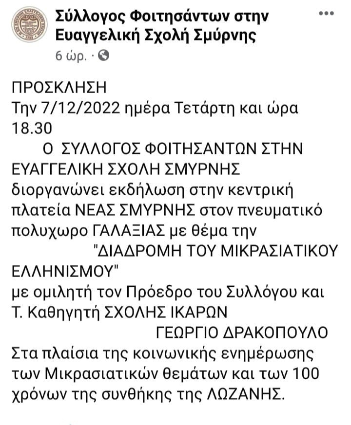 Πρόσκληση στην εκδήλωση "Διαδρομή του Μικρασιατικού Ελληνισμού" στον Γαλαξία Νέας Σμύρνης από τον Σύλλογο Φοιτησάντων στην Ευαγγελική Σχολή Σμύρνης