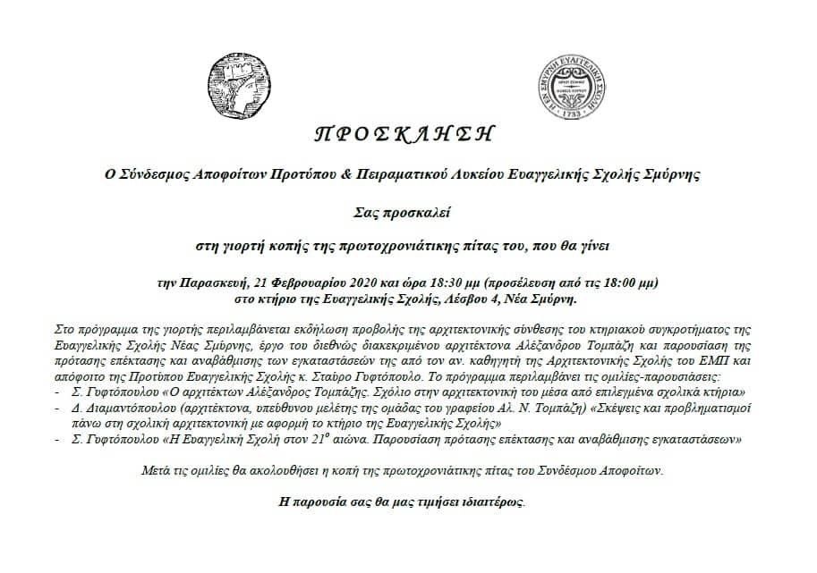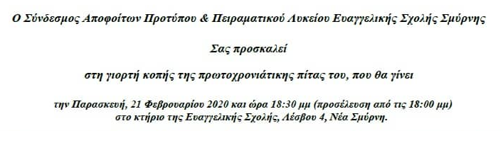 Πρόσκληση στην ετήσια κοπή της Βασιλόπιτας από τον Σύλλογο Φοιτησάντων στην Ευαγγελική Σχολή Σμύρνης