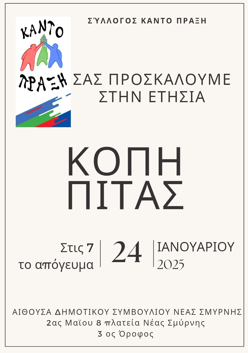 "Ο εθελοντικός σύλλογος Κάντο Πράξη σας προσκαλεί στην ετήσια κοπή της πρωτοχρονιάτικης πίτας, που θα πραγματοποιηθεί την Παρασκευή 24 Ιανουαρίου 2025, στις 19:00, στην αίθουσα Δημοτικού Συμβουλίου Νέας Σμύρνης (2ας Μαΐου 8 πλατεία Νέας Σμύρνης, 3ος όροφος)