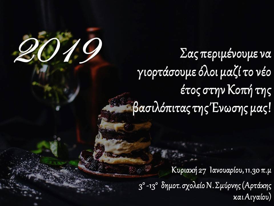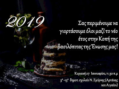 Σας προσκαλούμε στην κοπή της Πρωτοχρονιάτικης βασιλόπιτάς μας την Κυριακή 27 Ιανουαρίου, στις 11.30΄π.μ. στη φιλόξενη αίθουσα εκδηλώσεων του 3ου-13ου δημοτ.σχολείου Ν.Σμύρνης (Αρτάκης και Αιγαίου).