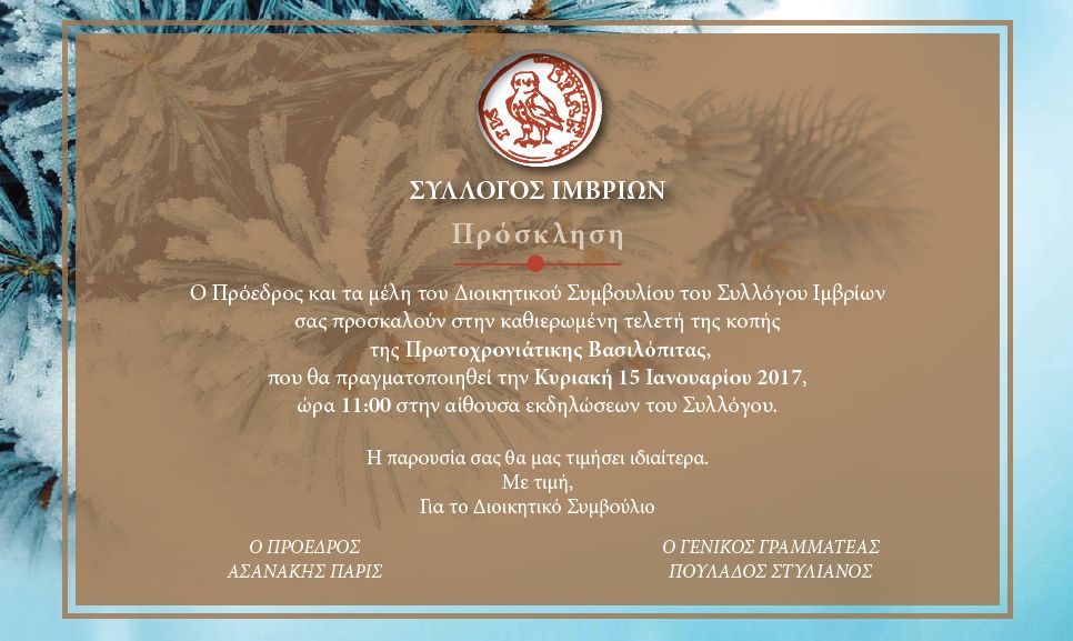 Πρόσκληση στην κοπή Πρωτοχρονιάτικης Βασιλόπιτας Συλλόγου Ιμβρίων
