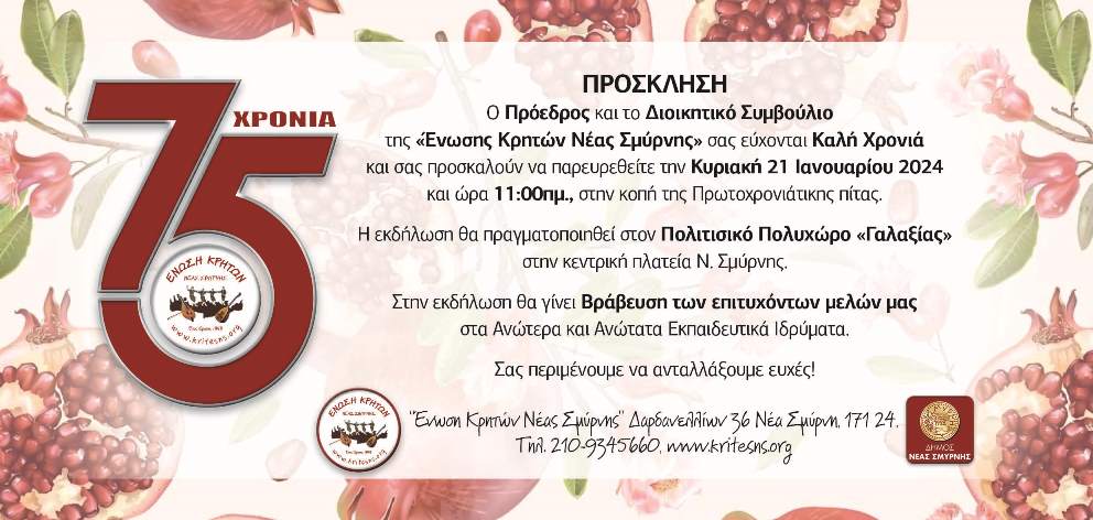 Πρόσκληση στην κοπή της Πρωτοχρονιάτικης πίτας της Ενωσης Κρητών Νέας Σμύρνης
