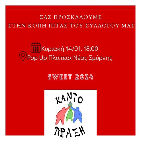 Σας προσκαλούμε τη Κυριακή 14/1 και ώρα 6 μ.μ. , στο Pop up (μέσα αίθουσα) 25ης Μαρτίου 13 πλατεία Νέας Σμύρνης, για την κοπή της πρωτοχρονιάτικης πίτας μας.