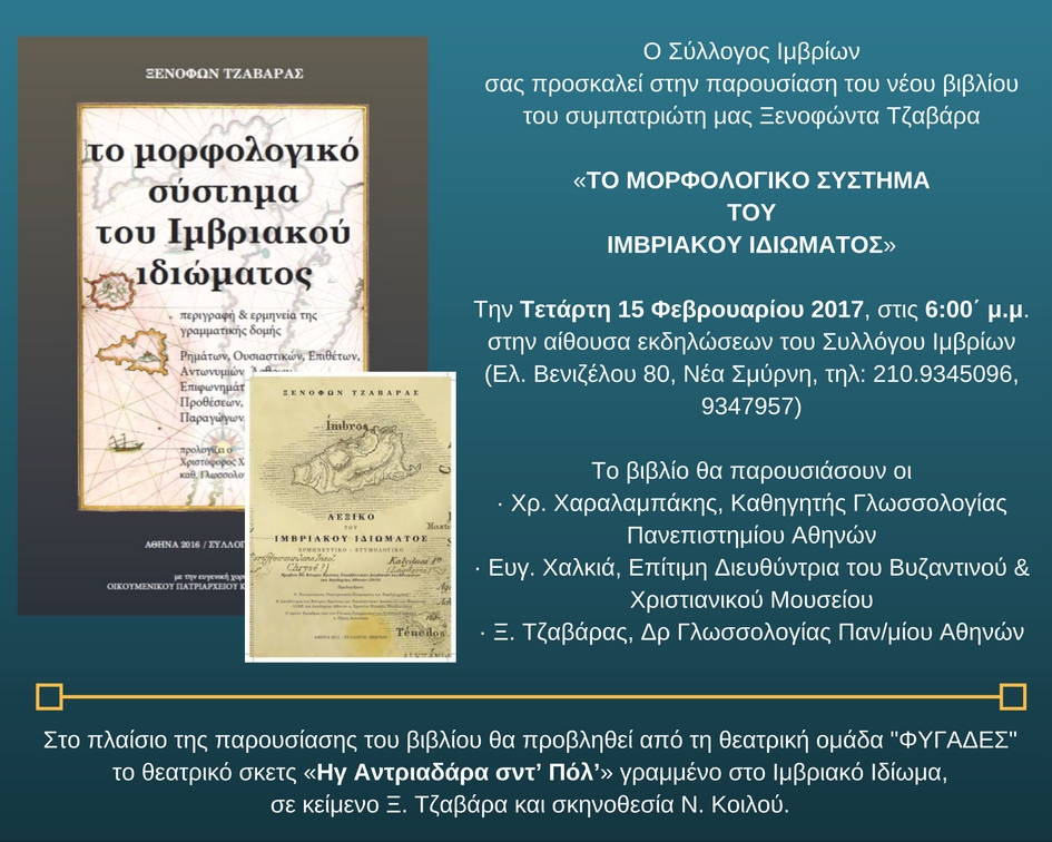 O Σύλλλογος Ιμβρίων σας προσκαλεί στην Παρουσίαση του νέου βιβλίου του Ιμβριου συγγραφέα Ξενοφώντα Τζαβάρα "Το μορφολογικό σύστημα του Ιμβριακού ιδιώματος"