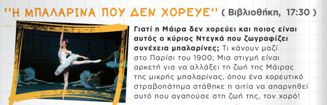 29 δεκεμβριου στις 17.30 μια ταξιδιαρικη αφηγηση με αφορμη εναν πινακα του Ντεγκα και ενα κοριτσι που θελει να γινει μπαλαρινα αλλα της λειπει η αυτοπεποιθηση! Καποιος ομως θα την βοηθησει σε αυτο...