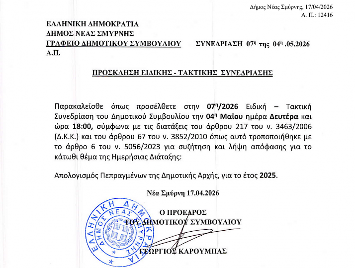 Ο Δήμος Νέας Σμύρνης καλεί τους ενδιαφερόμενους όπως προσέλθουν στην Ειδική-Τακτική Συνεδρίαση του Δημοτικού Συμβουλίου τη Δευτέρα 4 Μαΐου και ώρα 18:00 με θέμα τον Απολογισμό Πεπραγμένων της Δημοτικής Αρχής για το έτος 2025.