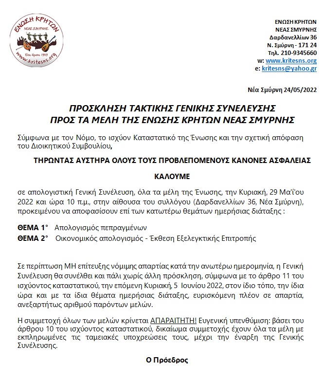 ΠΡΟΣΚΛΗΣΗ ΤΩΝ ΜΕΛΩΝ ΤΗΣ ΕΝΩΣΗΣ ΚΡΗΤΩΝ ΝΕΑΣ ΣΜΥΡΝΗΣ ΣΕ ΕΤΗΣΙΑ ΑΠΟΛΟΓΙΣΤΙΚΗ ΓΕΝΙΚΗ ΣΥΝΕΛΕΥΣΗ